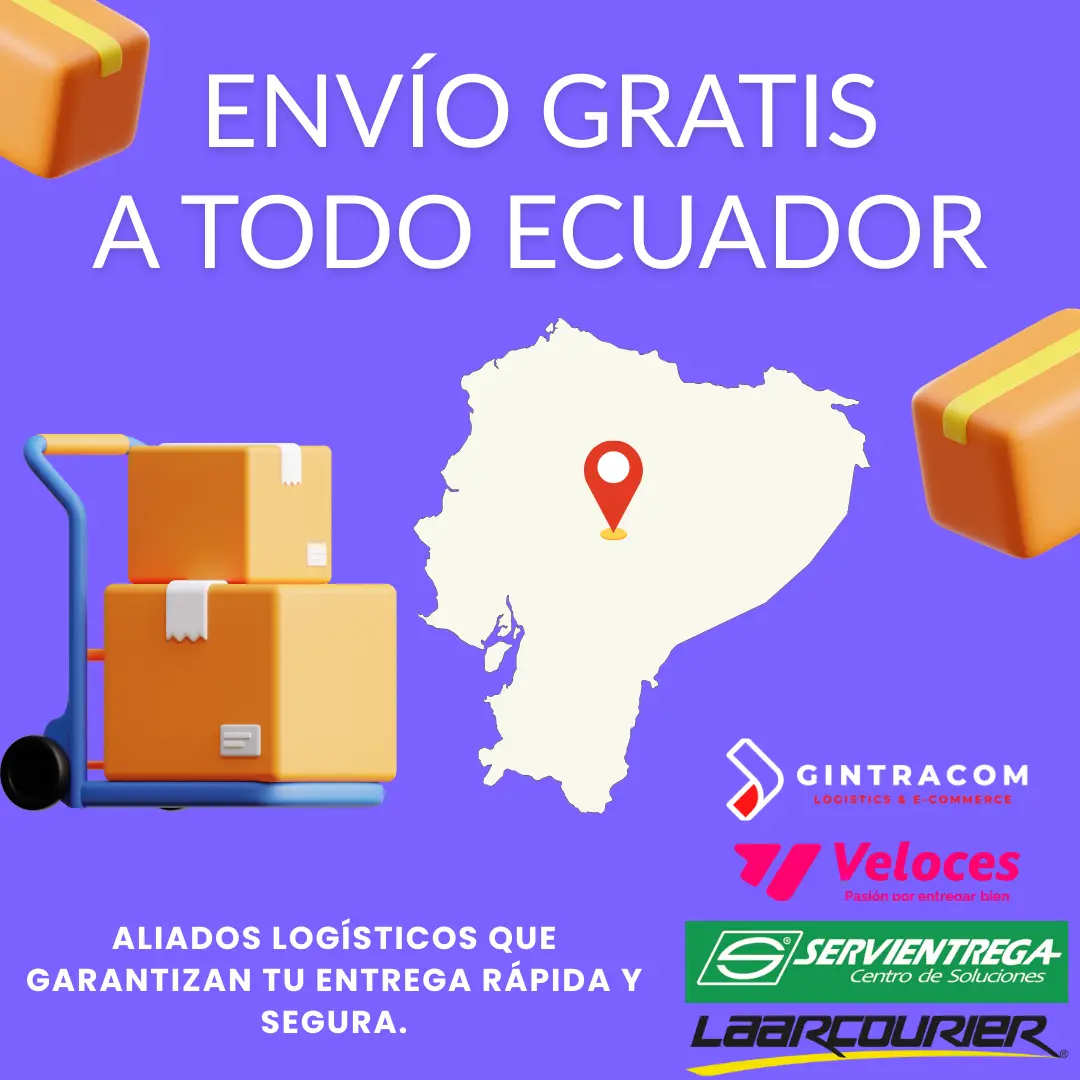 Trabajamos con una alianza estratégica junto a Servientrega, Gintracom, LaaurCourier y Veloces para que tus pedidos lleguen rápido y de forma segura. El envío es gratis, sin costos ocultos y con seguimiento disponible. Comprar y recibir en tu casa nunca fue tan fácil.
